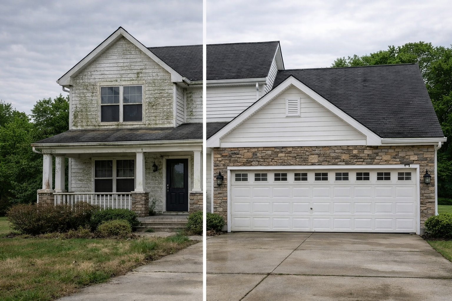 Unlike traditional high-pressure washing, a soft wash house cleaning uses low pressure and specialized cleaning solutions to safely treat and remove: